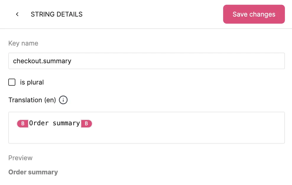 In the String details page, you can also mark a string as plural by checking the Plural checkbox. This allows to define two different texts. One for a singular form, and the other for more the amount grater than one. It is also possible to add one for a zero. In the "Values for Figma" field, you can set a default value that will be shown in Figma so you can work with the design with the text and see an example. The "Values for Figma" works for both variables and plurals alike.